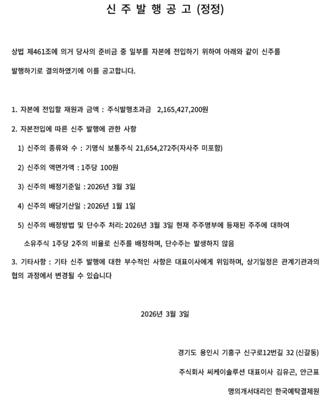 신 주 발 행 공 고 (20260212)(정정)